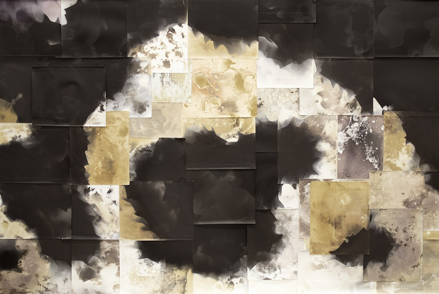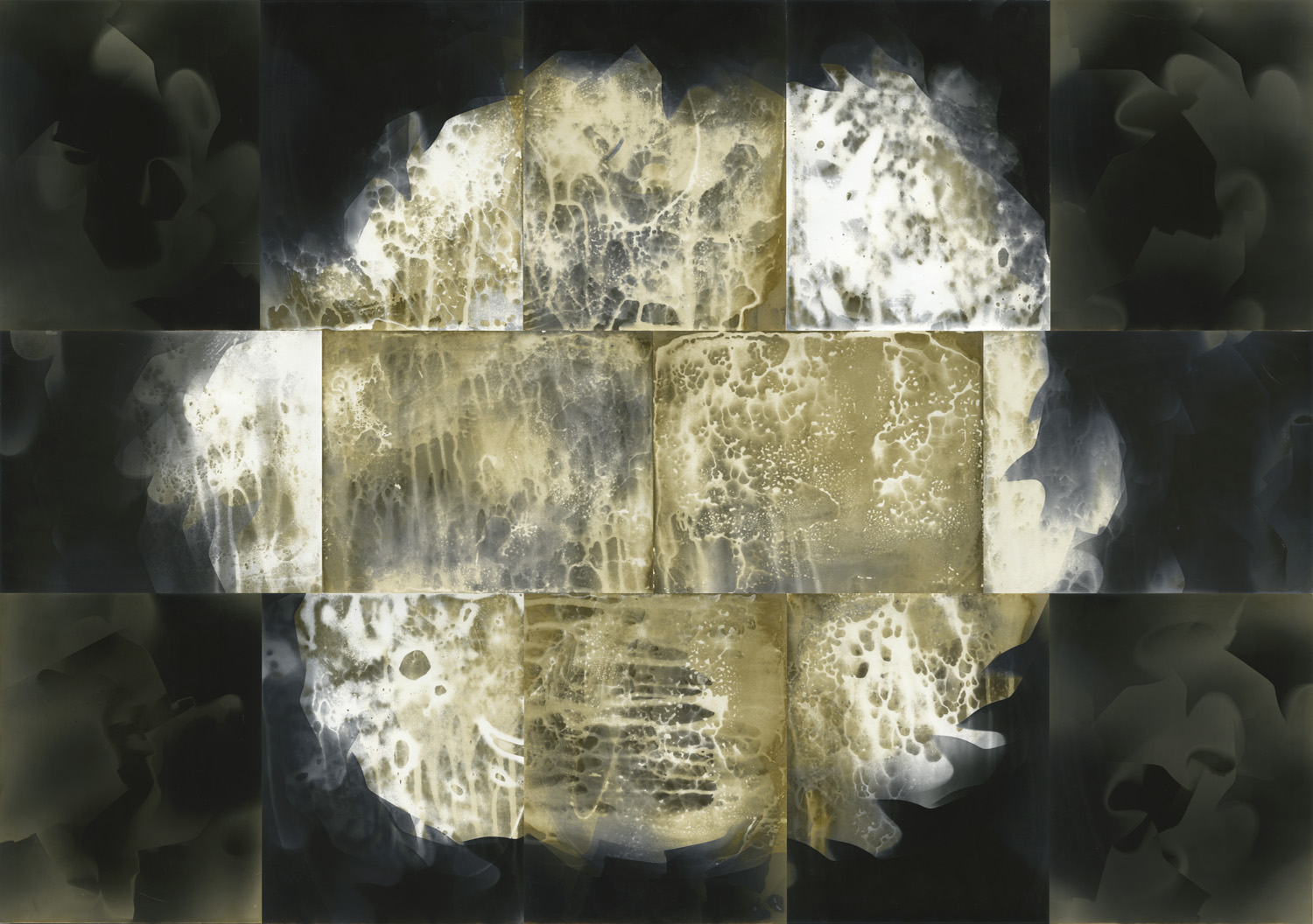 The artwork is assembled from unique, individually processed pieces of gelatin silver paper. Each piece is exposed by moving a small cabinet scraping plane across the paper to “draw” with light, then chemically processed to force color out of the normally B&W silver paper. This hand plane is intended to smooth exceptionally difficult, burled wood – its use is a metaphor for exposing and treating complex, deeply rooted tumult.